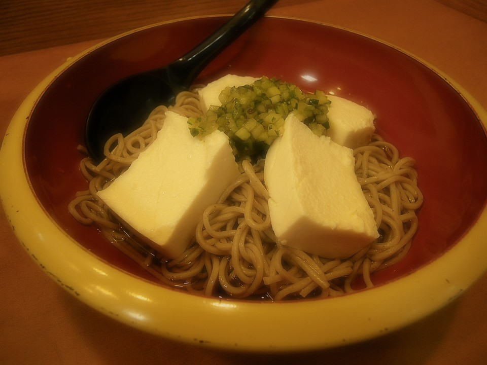 これは、冷かけそばに木綿豆腐とその上から山形の郷土料理の一つである“だし”(きゅうり、しそ、昆布などを細かく刻んだもの)を載せたメニューだ。
