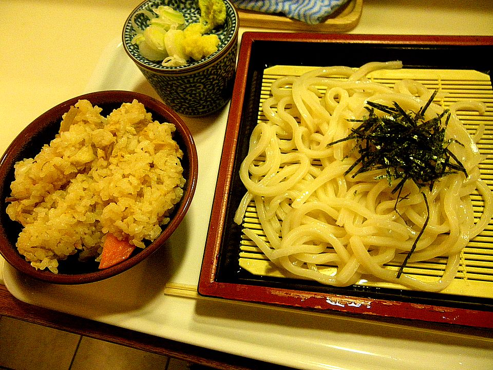 ざるうどん(350円)+かしわめし(200円)