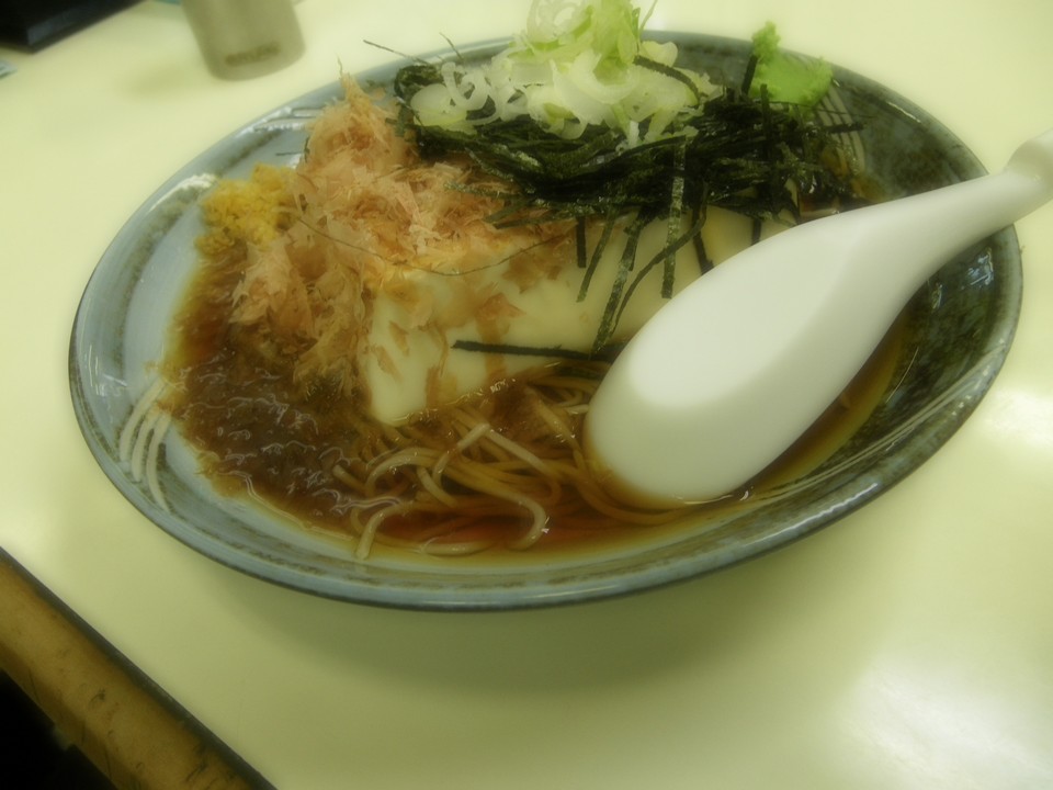 とりあえず麺を引っ張ったところで豆腐の重みで出てきやしないのでせっせと豆腐を食べ進めます。山盛りの鰹節や刻み海苔などの工夫に助けられますが後半は味に飽きてしまうところはあります。ようやく半分以上食べたところでそばも頂きます。よく締まったコシのある麺はまた冷たくて美味しい。つゆは他のものと同じものを使ってるみたいですね。あと意外にも、天かすが私的には気に入った。とても涼しげな季節メニュー、とても美味しかったです。ご馳走様。ただ、量と時間にご注意を、実際に見てみればまた涼しくなります(笑)