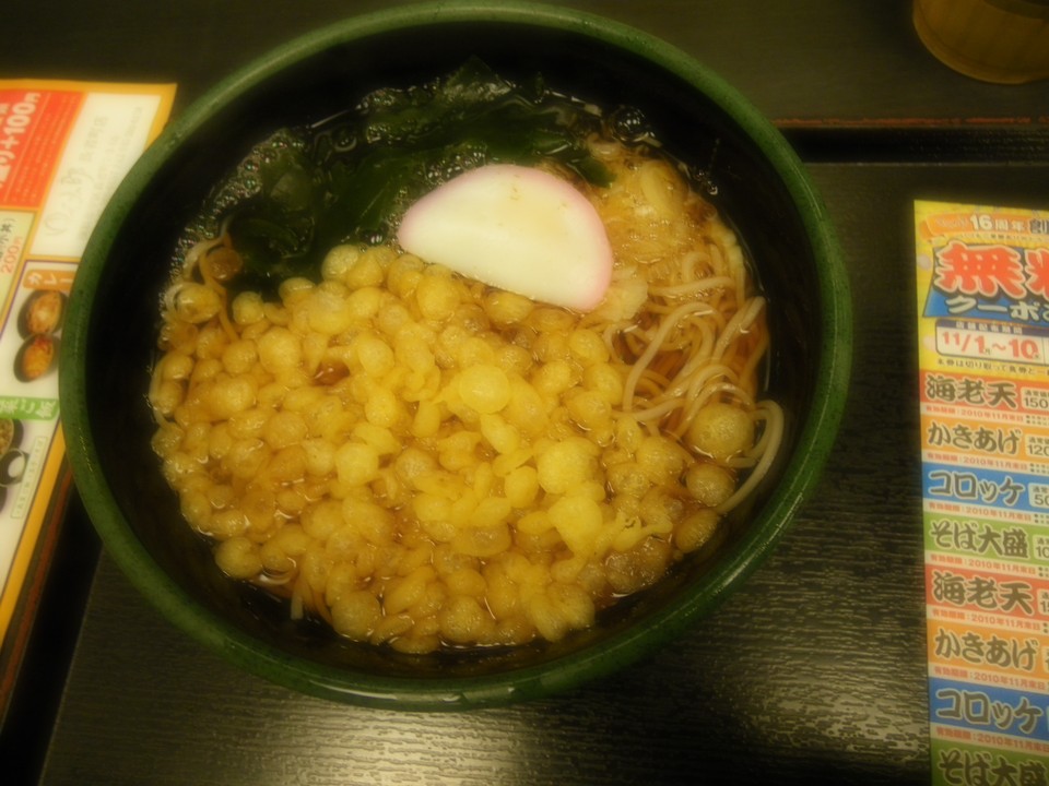そして蕎麦。大粒でサクサク感あふるる揚げ玉がナイス。↓のたぬきそばより品質が上がってるかも。