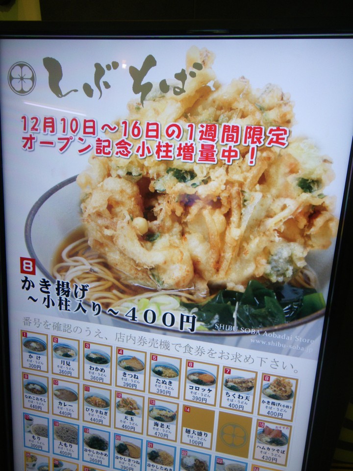 今回、しぶそば初登場!?と思われる、大型液晶ディスプレイによる電子メニュー。この画面の他、天茶ご飯(一体どういうものなのか・・・)、ハムカツそば(これも気になる・・・)などの青葉台店限定メニューも拡大表示されていて、ホームから改札へ向かう人々の注目を集めていました。駅そばでは珍しい試みです。