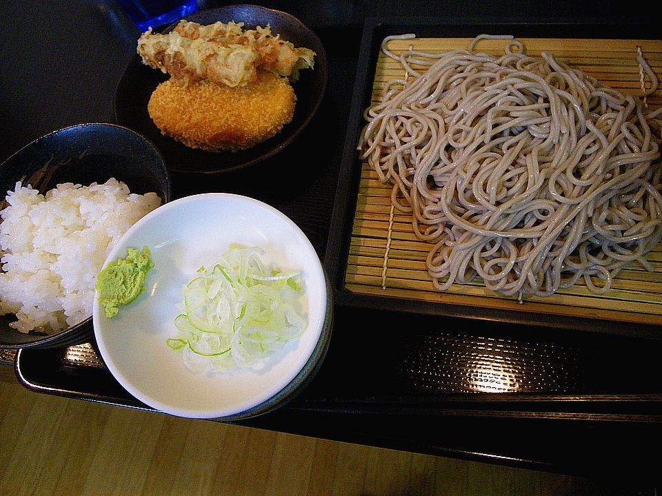 という訳で、まずはそばから。これがソフト麺なのか、御主人が湯通し後に丁寧に冷水で締めた蕎麦はプリプリとした食感とモチっとしたコシが見事で、茹で麺らしきバサバサ感も、ブチブチ感もいっさい感じられない。そしてもり汁もしっかり関西風。ねっとりと麺に絡む深い甘みある昆布出汁の美味しいつゆだ。そしてご飯と惣菜の方だが、ちくわ天は四分の一カットが2つとコロッケが1つ、卓上のソースをかけて頂くが、至って普通(冷凍?)。ご飯は粘着感たっぷり系で、おかずと合わせてねったりと喉に張り付く為、かけそばの方が良いのかと感じた。(または汁物が欲しい。。。)