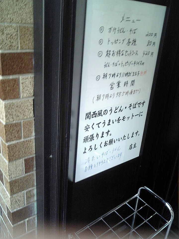 ここでも麺上げ(湯通し)は、大きな釜の前に立つシブい感じのマスターが担当、ちょっと相州っぽい。まず入口で「そばか、うどん」を告げ、その先の会計でトッピングなどの注文を。あれ、どっかに似たシステムだなぁ?