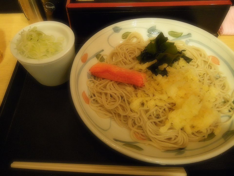 しかしながらこのつゆ、冷しにしては随分甘いなぁと思った。温かい蕎麦であればやや甘目のつゆも悪くは無いのだが、冷たい蕎麦はやはりピリリとした辛い汁でないと締まらない。ついでに、揚げ玉が湿気ていてフニャっとしているのも非常に残念な点だ。