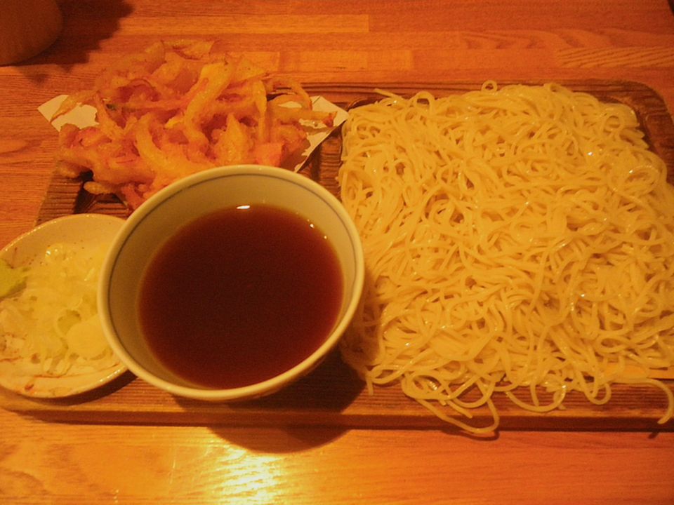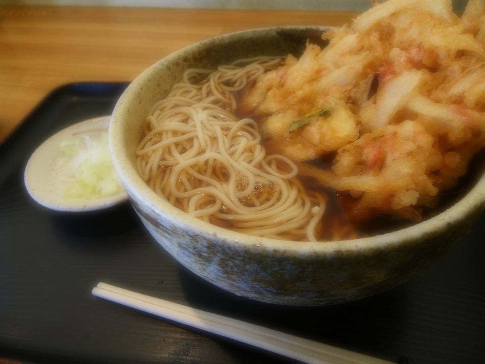 麺を茹でている最中のようで、待つこと暫し、大きな丼に大きなかき揚げ、見た目も豪勢な一杯が出てきた。別皿のネギもちょっと高級感を与える。まずは大きなかき揚げにパックリと噛みつけば、野菜の甘みとシャキシャキとした食感が広がる。相州そばの天ぷらを大きくしたような感じだろうか。つゆに浸ると衣の部分がブヨブヨと固くなって食べる気を大いに削がれるので、なるべく早く食べ切る事を推奨したい。