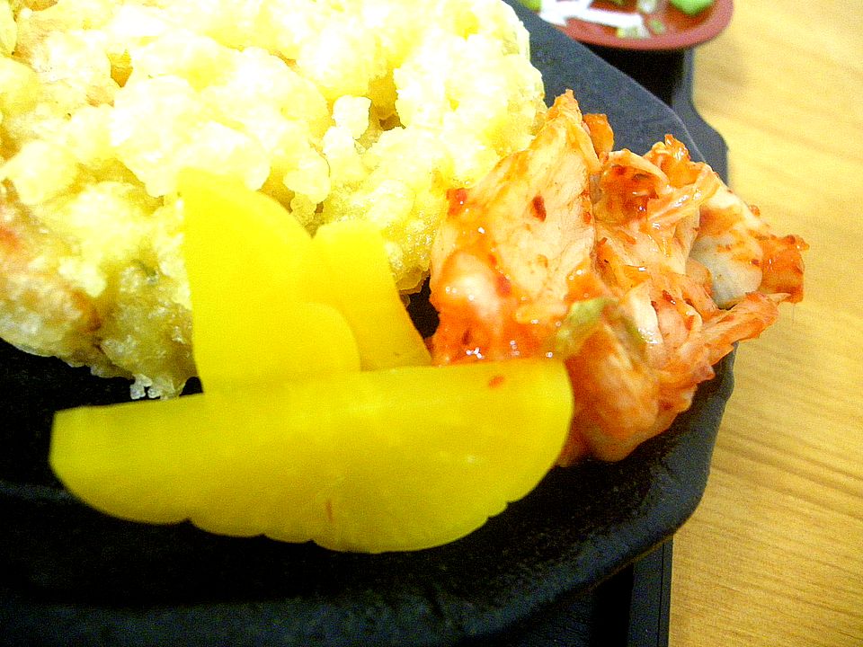 天ぷらは多めの衣で海老と牛蒡、玉ねぎ、人参が固めてある。見た目に反してサクッとしていて悪くない。