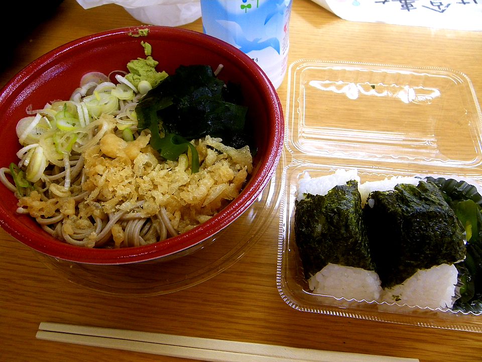 まず、そばの方から。店で食べれば「もりそば」にわかめが乗り、つゆに天かすが入る状態だが、どうも「もり」は出来ないようだ。所謂冷したぬきそばの体である。店から近い事が功を奏し、イート・インと変わらぬ状態で頂く事が出来た。