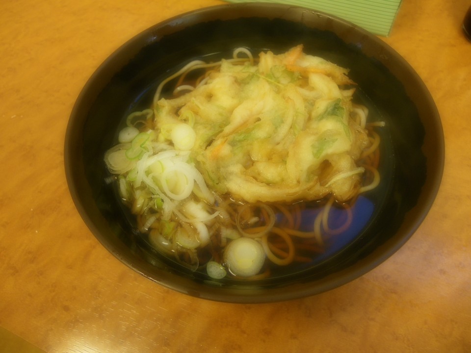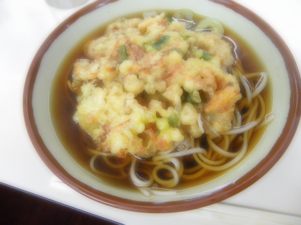 天ぷらはこちらではよく見かける、揚げ玉を固めたもの。すなわち、食べ始めるとともに「たぬきそば」になる。