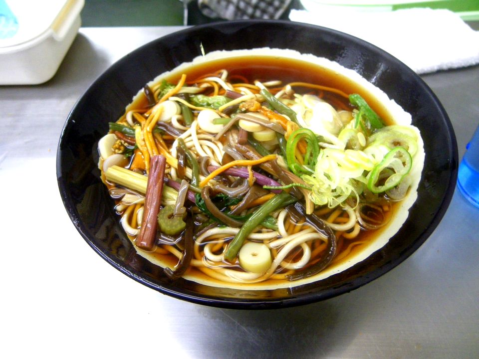 外観は普通の日本蕎麦屋に見えるが、前払い制で値段も手頃、天ぷらそば400円也。食器の上げ下げは店の方が行なってくれる。さっそく頂いてみると、さすが製麺所だけあって麺は見事。モチっとしたコシで香りも良い(時間からして茹で立てかしら?)。つゆはカエシが濃い目、かなりしょっぱくこの辺りは立ち蕎麦の雰囲気。ガシガシと揚がったコロモ多めの天ぷらもまた然り。それから、見た目にも綺麗な青菜が載る。