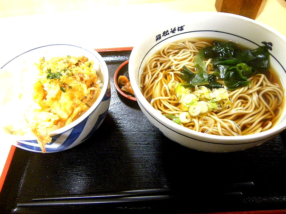 店に着くと行列が出来ている状態。食券を買って列に並ぶと、ドンドンと進んでいく。見ていると厨房は5人ぐらいで回していて、常時麺を茹でながら、食券を受けてベースのかけそばを用意しながら指示を出す人、ネギを始め揚げ物類のトッピングをする人、奥で天ぷらを調理する人、同じく丼ものを作る人、、、という分担で非常にスムーズで効率の良いフォーメーションで捌いていてお見事。