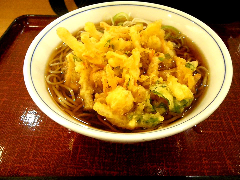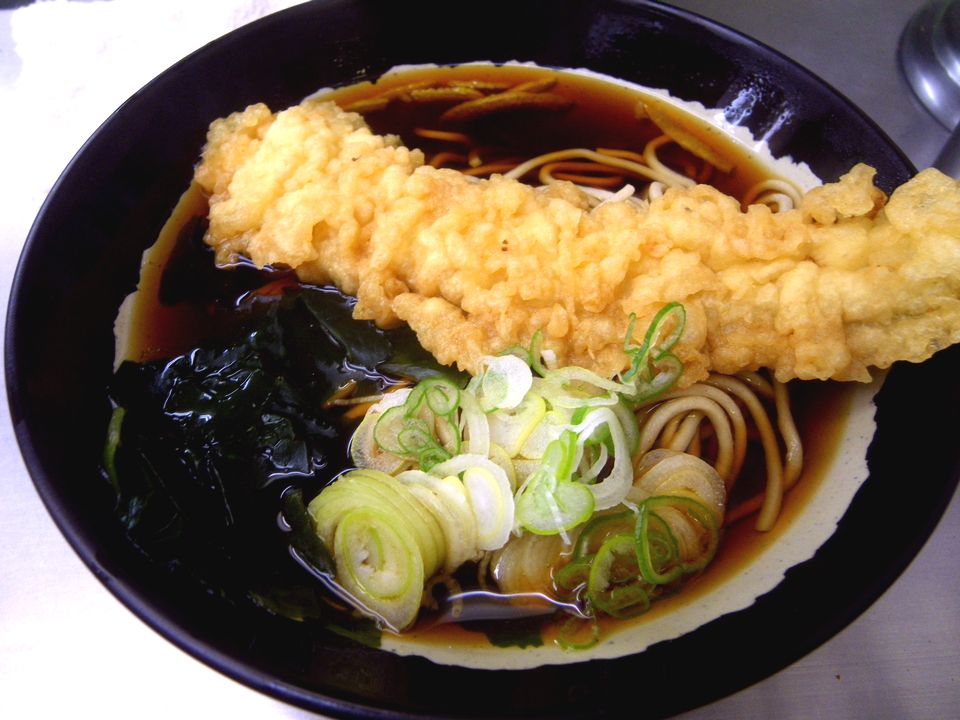 食券を渡すと、サッと茹で麺を湯通しし、揚げ置かれた天ぷらをバットから取ってのせ、つゆをかけ、ネギを乗せて完成。見方によっては手抜きとしか言いようのない動作であるが、駅そばのこの早さは、食事すらダルい私のような者にとっては最早美しささえ感じられる。