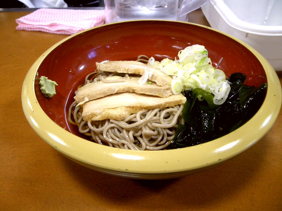 冷かけにワカメと鶏肉が3枚載った蕎麦は見た目シンプル。ひとまず肉以外について再確認しておくと、どうも今回はイマイチ冷し足りなく、ぬるい温度が全体の印象をぼかしてしまっているような。