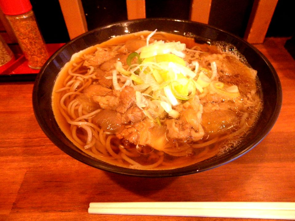 小ぶりなメラミンの器にたっぷりと盛られた蕎麦。とろとろに煮込まれた牛肉が贅沢にたっぷり乗っかっている。ほろほろとした食感、とろけだした牛肉の脂とタレの甘みが実にうまい。牛めしもあるようだから、今度はぜひご飯と一緒に食べてみたい。そばは注文後茹での茹で麺。ヒョロっとした感じでコシ、喉越しともに悪くない。つゆはやや甘めで、牛肉との境界が少し薄れてしまっているような。もしかしたら私個人の好みの問題かもしれない。