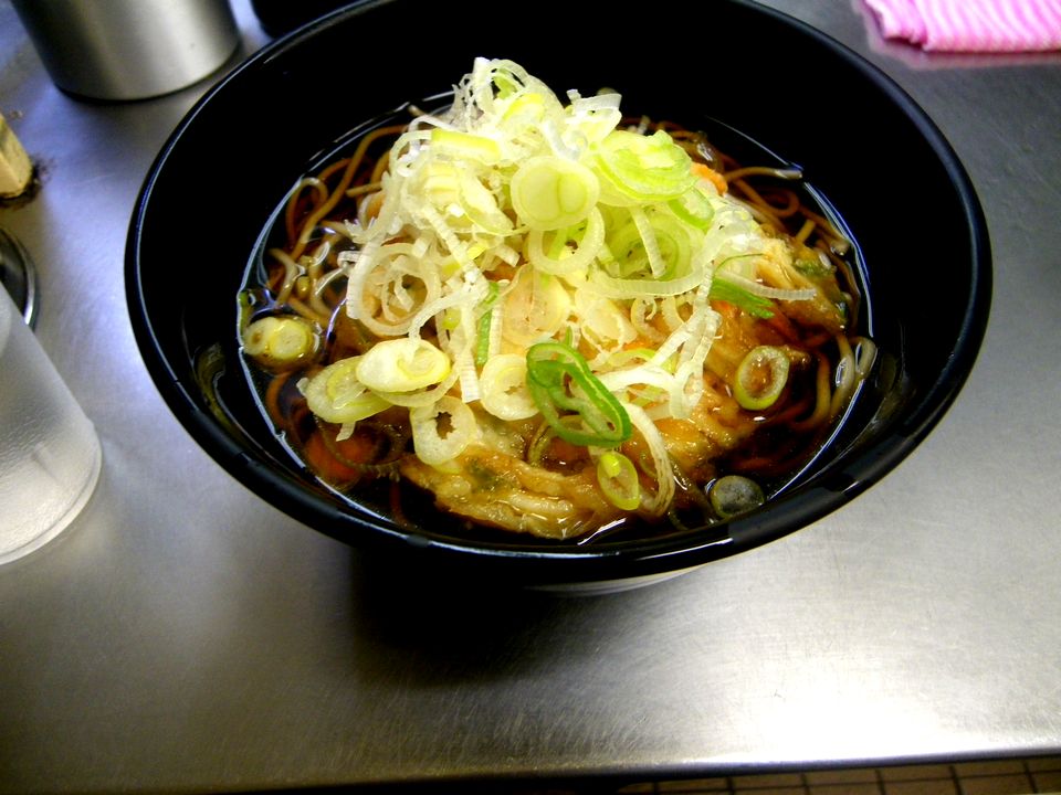 食券を渡すと、サッと茹で麺を湯通しし、揚げ置かれた天ぷらをバットから取ってのせ、つゆをかけ、ネギを乗せて完成。見方によっては手抜きとしか言いようのない動作であるが、駅そばのこの早さは、食事すらダルい私のような者にとっては最早美しささえ感じられる。